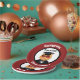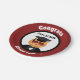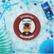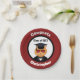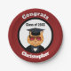 The cute, funny, whimsical design in the centre of this paper plate features a cool orange tabby cat wearing a graduation cap and deep red sunglasses. Above the cat are the customisable words, "Class of 20XX" in popular typography. The entire design is surrounded by a circular black border on a white background. Surrounding the cat is a deep red background with the customisable message, "Congrats" above the cat and a customisable name below.