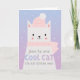 Cute, funny pun Valentine's day card. An illustration of a white cat wearing a pink beanie and a scarf. The background is in pretty purple and blue ombre colour with snow. The text says "you're one cool cat. I'm not kitten you!"