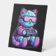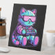 Step into the vibrant world of gaming with this striking illustration of a blue and pink striped cat, rocking sunglasses and confidently holding a game controller. This playful and trendy artwork is perfect for gamers and digital art enthusiasts who appreciate a touch of retro flair.