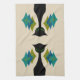 The Cool Cat Mid Century Modern Retro kitchen towel features 1950s - 1960s style black cats with green eyes and retro diamond graphics in green and blue. The background is off-white (bone).