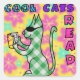 These colourful retro reading incentive stickers for students say "Cool Cats Read" and feature a green gingham cat who is wearing cool shades while reading a book.