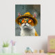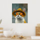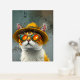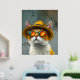 A fun and vibrant digital painting of a fashionable cat wearing a stylish straw hat and reflective sunglasses. The warm orange tones contrast beautifully with the textured background, creating a playful and charismatic look. This whimsical artwork is perfect for cat lovers and those who enjoy quirky, expressive illustrations.
