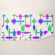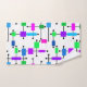 This towel set has a mid-century modern design of a grid made of horizontal and vertical black lines with rectangles in various vibrant shades of green, blue, and purple.