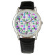 This watch has a mid-century modern design of a grid made of horizontal and vertical black lines with rectangles in various vibrant shades of green, blue, and purple.