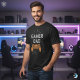 This graphic t-shirt design features the text "gamer dad" prominently displayed in a bold, multiple colour. The font could be: