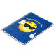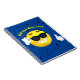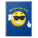 Fun notebook design for youth. A smiling cool emoji- wearing sun glasses- on a bright blue backdrop with black letters scattered around. Yellow text is for personalisation.