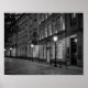 Evening view of old, historical buildings and cobblestone street in Altstadt Dusseldorf. People walk in blurry motion. Black and white photography of European / German architectural style.