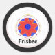 A fun sticker featuring a white frisbee with blue and red designs. The saying 'frisbee' can be changed or removed.
