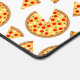 Cool and fun pizza slices pattern on white for birthday pizza party. Juicy vector made pizza with crunchy crust, cheese, salami, champignon mushrooms, olives and a sprinkle of oregano.