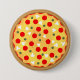 Accessories Pin Buttons for pizza party birthday celebration. Juicy vector made pizza with crunchy crust, cheese, salami, champignon mushrooms, olives and a sprinkle of oregano.