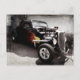 A dark and gritty street shot of a souped up hot rod glinting in the sun and casting deep shadows on the pavement in a dirty downtown area. Shiny chrome pipes and exhaust stand out against the rich black paint, with a fiery red, orange and yellow burning flame paint job on the door. Chopped narrow windows makes it look extra gangsta.