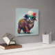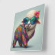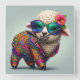 This image features a cute lamb dressed in a vibrant, patterned suit and wearing sunglasses, adding a lively and entertaining persona to the image. A flower is delicately placed on the sheep's right ear adding further charm to the character. This colourful sheep is set against a light-coloured background, further emphasising the vivid details of the sheep's attire. The brightness of the colours and the playful details give the image a cheerful and eye-catching ambiance.