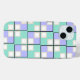 Purple color squares in black color frames diagonally decorated with light brown and white inner squares over cool mint green background color
