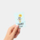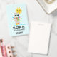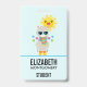 Name badge with a cool looking llama wearing some dark sunglasses. Dressed in a colourful striped scarf and fun little boots. A bright yellow sun with a happy kawaii face in the background. Whimsical colourful triangles surround this fun loving llama. Blue background.