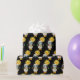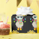Wrapping paper with a cool looking llama wearing some dark sunglasses. Dressed in a colourful striped scarf and fun little boots. A bright yellow sun with a happy kawaii face in the background. Whimsical colourful triangles surround this fun loving llama. Black background.