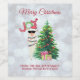 Wine labels with a funny illustration. A cute llama wearing black sunglasses and a red santa hat. Standing behind a Christmas tree with festive presents. The word Joy written above his head in a colourful holiday font. Silver bokeh background. Whimsical and fun Christmas themed design.