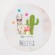 Personalised waterproof labels illustrated with a cute llama wearing heart-shaped sunglasses. Some stars, a mushroom and a green cactus complete the illustration. Whimsical and cute.