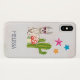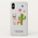 Personalised phone case illustrated with a cute llama wearing heart-shaped sunglasses. Some stars, a mushroom and a green cactus complete the illustration. Whimsical and cute.