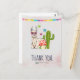 Thank you postcard Illustrated with a cute llama wearing heart-shaped sunglasses. Some stars, a mushroom and a green cactus complete the illustration. Whimsical and cute.