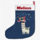 Christmas stocking personalised with a name. A funny illustration. A cute llama wearing black sunglasses and a red santa hat. Also wearing a South American styled blanket and pom-poms. The word Joy written above his head in a festive colourful font. Blue snowflakes falling down.