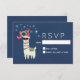 A Christmas RSVP card with a funny illustration. A cute llama wearing black sunglasses and a red santa hat. Also wearing a South American styled blanket and pom-poms. The word Joy written above his head in a festive colourful font. Blue snowflakes falling down. Set on a blue background. Whimsical and fun Christmas themed design.