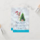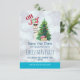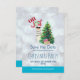 Save the date card for a christmas party. A funny illustration. A cute llama wearing black sunglasses and a red santa hat. Standing behind a Christmas tree with festive presents. The word Joy written above his head in a colourful holiday font. Silver bokeh background with an icy blue border. Whimsical and fun Christmas themed design.