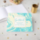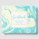 A stylish and sophisticated wedding guestbook with an elegant faux marble pattern with swirling colours in turquoise blue and cream colours. A cream coloured frame with a gold border layered over top with your personalised wedding details inside.