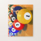 Cool puzzles for guys in a challenging jigsaw puzzle with billiard balls in a bright colourful pattern the the balls lined up in racked position. A masculine puzzle for men worthy of framing when completed.