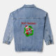 This denim jacket has a cool skeleton with ornament eyes wearing a red Santa Hat inside a dimensional bright red and green splatter shape. Merry Christmas text in red.