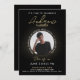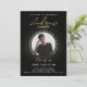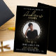 Celebrate your graduation party in style with this modern photo invitation, perfect for inviting family and friends to your special event. The front features a sleek minimalist design with faux gold handwritten script, clean white typography, and a customisable circular photo at the centre, all set against a sophisticated black background. The reverse side continues the chic look with the same elegant black backdrop for a polished finish. Easily personalise your card by updating photos and text. This versatile design blends elegance and simplicity, making it ideal not only for graduations but also for an elegant prom or charity gala.
