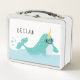 Make your child's day extra cool with this arctic design! The illustration features a blue narwhal splashing in the water. This cute whale has a yellow tusk, happy smile and is wearing blue glasses.