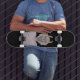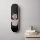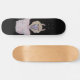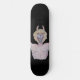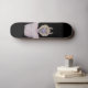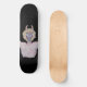 This cool one of a kind skateboard has an original illustration of a red eyed demon on it. The purple faced demons face covers the back of the board. This demonic creature has an open mouth and a purple tongue. Two slightly curved horns are protruding from the top of his head and you can see the top of his scar marked chest. This demon portrait really stand out against the black background.