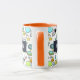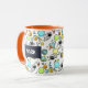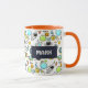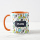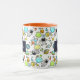 Personalised coffee mug with a cute and colourful pattern with all kinds of outer space themed elements. Images include astronauts floating around in their white space suits. Stars and planets and cool little rocket ships, spaceships, and satellites. Fun and crazy design. Perfect for space-loving scientists.