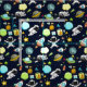 Fabric with a cute and colourful pattern with all kinds of outer space themed elements. Images include astronauts floating around in their white space suits. Stars and planets and cool little rocket ships, spaceships, and satellites. Fun and crazy design.