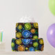 A cool and colorful design depicting a pattern of pickleballs surrounded by spiralling energy.