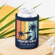 Personalised navy blue beach can coolers for your family trip to Hawaii, Florida, or other tropical island destinations. Cool palm trees sway against retro colours of orange and yellow above your customised vacation name in white script. Matching keepsake gifts are great for a group going on a cruise or coastal getaway.
