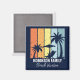 Personalised navy blue beach magnet keepsake for your family trip to Hawaii, Florida, or other tropical island destinations. Cool palm trees sway against retro colours of orange and yellow above your customised vacation name in white script. Matching gifts are great for a group going on a cruise or coastal getaway.