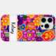 Make a retro statement with this groovy 70s inspired hippie flower power floral iphone 15 pro max phone case! It's modern and trendy with bright multi-coloured painted flowers. Make it uniquely yours with your name in a modern script font in black. It will look fabulous on your phone!