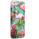 Nostalgic and cool design in bright graphic colours featuring pink flamingos and green palm trees against a deep sky blue background.