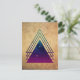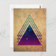 A cool sci-fi illustration with a grunge background. The background is an aged grungy antique brown colour. The illustration is composed of a big triangle filled with blue and purple outer space imagery and texture. This triangle is surrounded by several blueish purple triangle outlines which stack upward.