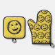 Cool Stained Happy Smiling face pattern yellow Oven Mitt & Pot Holder Set. Cool Spilled Stained Happy Smiling faces on gold yellow.