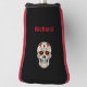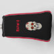 Golf putter cover shows a sugar skull with red hearts in the eyes, flowers, and a cross on the forehead. Personalise the name. Customise the black background colour and red piping. Cool, classy, tasteful, gothic.