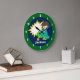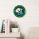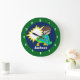 Custom superhero kids room wall clock personalised with your child's name. An awesome super kid in a blue and green costume.