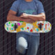 Cool T-Rex Dinosaur Skateboard with Your Name. Cool customisable Tyrannosaurus Rex T-Rex dinosaurs with colour stars and coloured dinosaur pattern background with custom "Name" skateboard. This cool skateboard with your name is fully customisable, type in your name and add even more texts and images. A great T-Rex birthday or Christmas gift to the big little dinosaur fan!