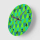 This wall clock has a Bauhaus design of repeating trapezoids in shades of blue and green.