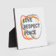 Cool, unique, trendy, urban design of a saying "love, respect, peace" in orange, yellow, grey colors. Curvy, organic shaped brush strokes are used. Modern, trendy, simple vector art, graphic design artwork.