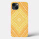 An iPhone 13 case with a colourful yellow, mustard and white kaleidoscope mandala design.