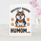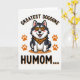 This card features a cheerful, stylized black-and-white dog with pointed ears and a fluffy tail, standing front and center with an open-mouthed grin and soft pink cheeks that feel like a friendly flirt ❤️. The dog wears orange-framed sunglasses with a dotted pattern and a matching bandana, giving it a confident look that still reads tender and affectionate. Curved text wraps around the character in big black letters with an orange shadow, reading “GREATEST DOGGONE HUMOM...” to keep the message light and adoring. The words sit prominently near the top and around the figure, making the compliment the first thing you notice. Four orange paw prints are placed evenly around the design, adding a rhythmic, upbeat touch 🌼. The background stays plain white, so the warm oranges and yellows pop against the dog’s monochrome coat. The overall style is graphic and smooth, with crisp edges and simple shapes that keep the focus on the dog’s beaming face. The orange paw prints appear near the corners, framing the dog against the white space.