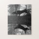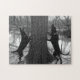 This puzzle features a photo of two black and tan coonhounds treeing on the river in black and white.
