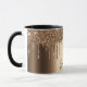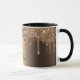 An elegant, girly and glam mug. Faux bronze glitter drip, paint drip. Dark copper looking background. Template for your name written with a hand lettered style script. Brown coloured letters.